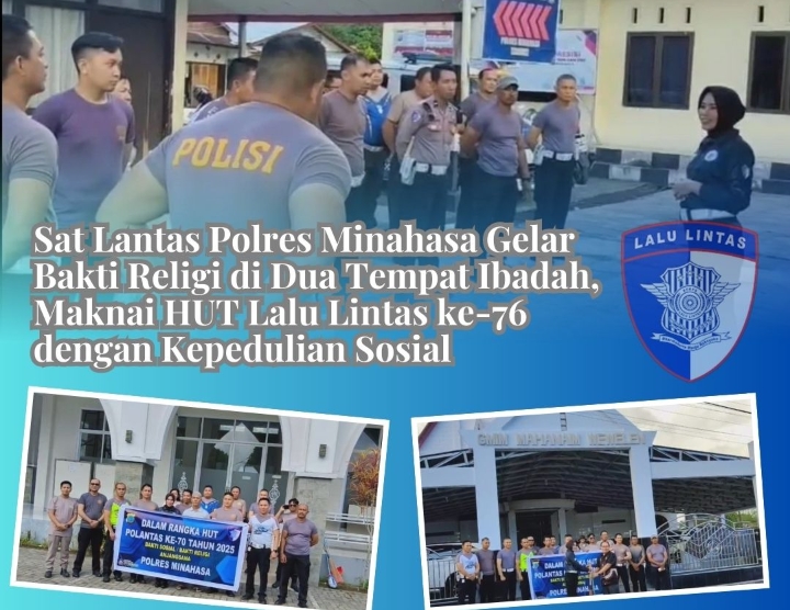Minahasa — Dalam rangka memperingati Hari Ulang Tahun Lalu Lintas Bhayangkara ke-76, Satuan Lalu Lintas (Sat Lantas) Polres Minahasa melaksanakan bakti religi di dua rumah ibadah, yakni Gereja Mahanaim Wewelen dan Masjid Al-Hikmah Sumlangka, Kamis (11/9/2025). Kegiatan yang dipimpin langsung oleh Kasat Lantas Polres Minahasa AKP Sumiaty Pontoan, SE ini menjadi wujud nyata kepedulian sekaligus ungkapan rasa syukur atas pengabdian Polri di bidang lalu lintas.